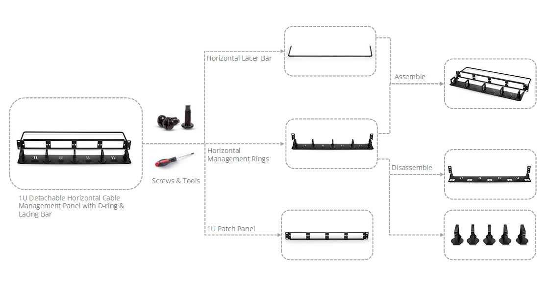 Rack mount enclosures are available in various styles to assist with managing patch cords. Among the different types, the 1U detachable rack mount enclosure is the most versatile choice due to its multiple applications. It consists of four parts: horizontal lacer bar, horizontal lacer panel, D-rings, and 1U patch panel. For easy installation, this horizontal cable organizer comes complete with M6 rack screws. It can be used with the existing devices to self-design the cabling. For instance, the 1U lacer panel and 1U cable management bar can be combined to form a pattern that holds the 1U fiber patch panel to manage high-density structured cabling in data centers efficiently.