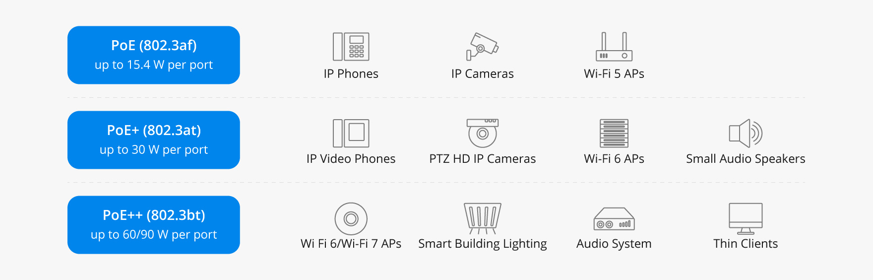 Application | VoIP phones, low-power wireless access points, sensors | HD IP cameras, dual-band access points | High-power devices, such as PTZ cameras, network-attached storage |