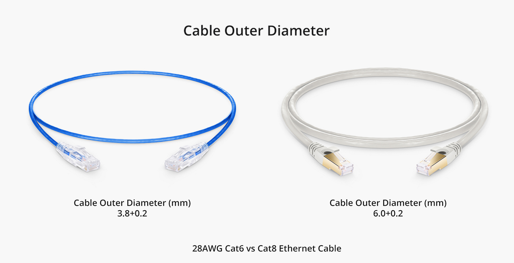 In contrast, even with the same 28AWG conductors, the slim Cat6 Ethernet cable has a significantly smaller diameter than Cat8, as shown in the image below, making it easier to install and manage.