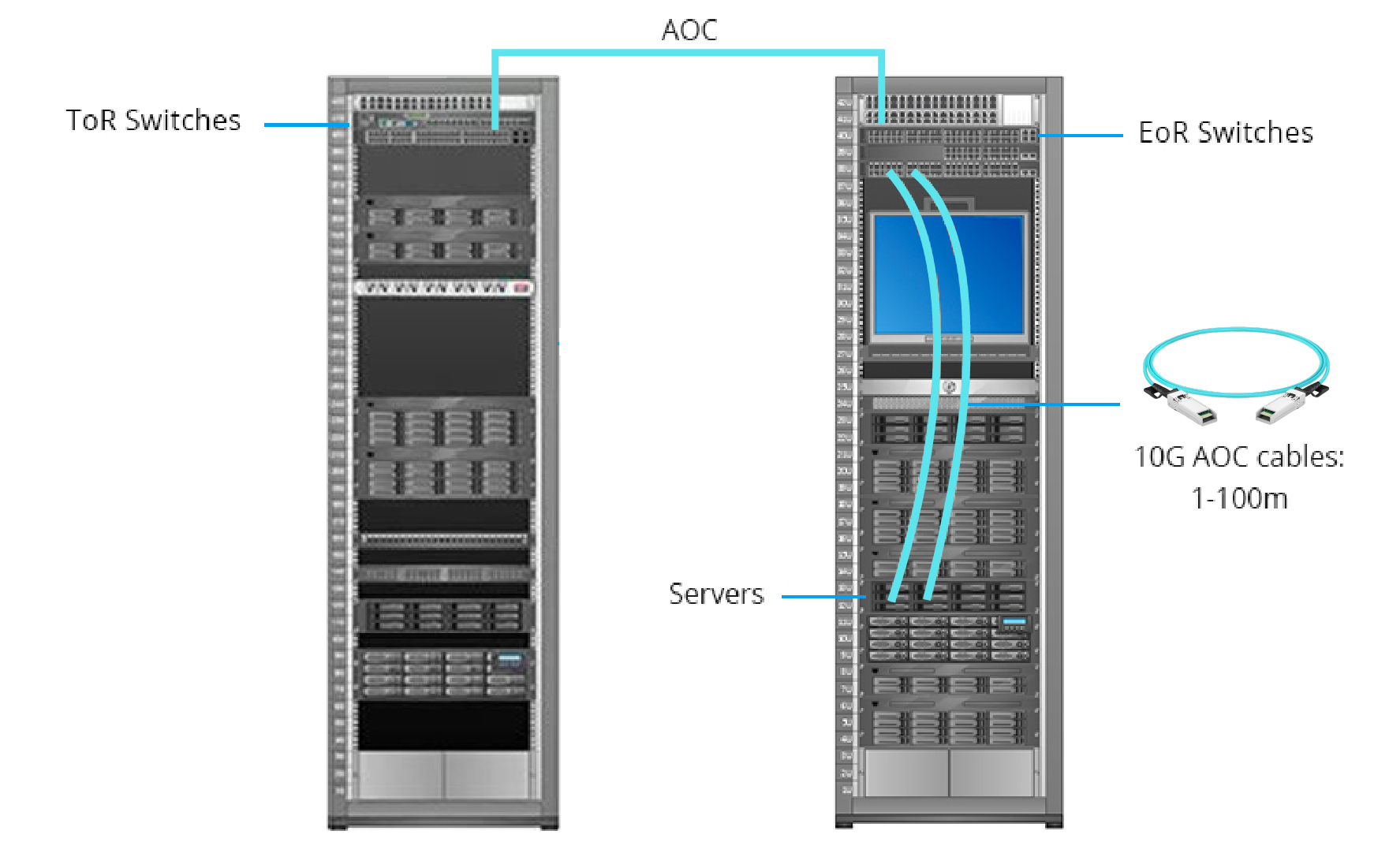Unlike DAC cables, 10G SFP+ AOC cables are not constrained by short copper reach limitations and are widely used for longer interconnects within data centers. They are commonly deployed in Top-of-Rack (ToR), End-of-Row (EoR), and Middle-of-Row (MoR) architectures, where servers connect to ToR switches using AOC cables.