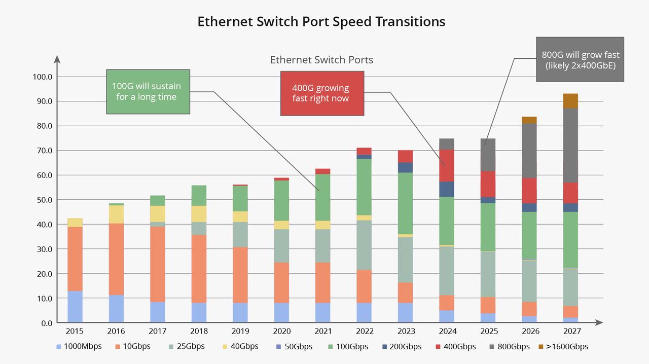100G ports dominated the market until around 2021, after which 400G entered a rapid growth phase. Between 2025 and 2027, 800G ports are expected to expand dramatically, effectively doubling per-rack capacity compared to 400G deployments. This trend reinforces the importance of designing architectures that accommodate higher bandwidth, lower latency, and more scalable pod sizes.