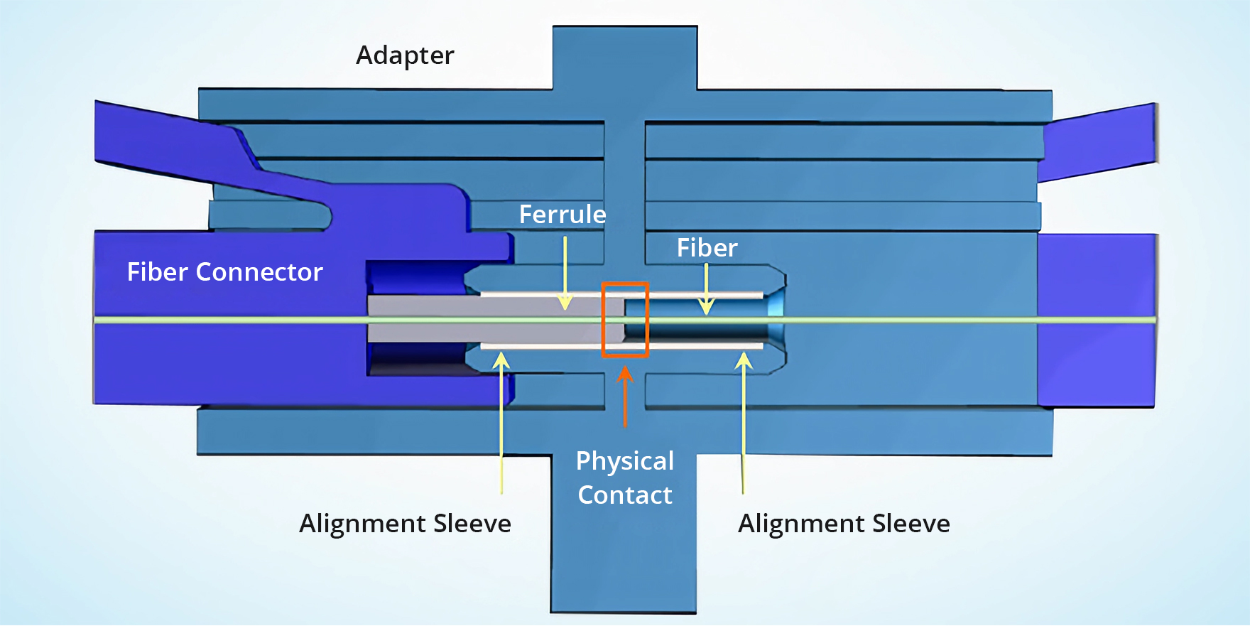 A fiber optic adapter, also known as a fiber coupler, is a passive device used to connect and align two optical fiber connectors. It enables optical signals to pass from one fiber to another with minimal loss, ensuring stable and reliable communication. A fiber optic coupler works by precisely aligning the fiber cores to enable efficient light transmission. Inside each adapter is an alignment sleeve, which holds and aligns the ferrules (the ceramic part inside each connector) of two mating connectors. When two connectors are inserted into the adapter, the sleeve ensures that the fiber cores are perfectly aligned, allowing light to transmit with high efficiency and minimal insertion loss.