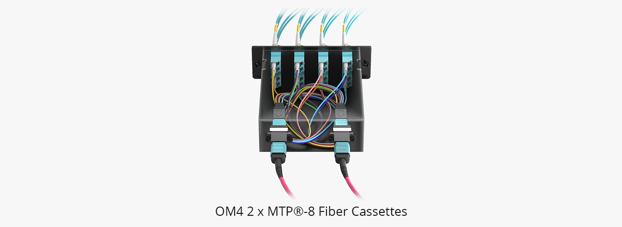 MTP®-8 fiber cassettes feature one rear 8-fiber MTP® adapter connection and 4 duplex LC adapters in the front, supporting a total capacity of 8 fiber connections per cassette. The fiber cassette is ideal for high-performance deployments, including 40G to 10G, 100G to 25G, and 400G to 100G migration scenarios. This Base-8 MTP® fiber cassette enables efficient port breakout and is designed to upgrade existing LC duplex links to SR4 parallel optics without fiber waste, maximizing cable utilization and ensuring seamless polarity alignment in high density environments.