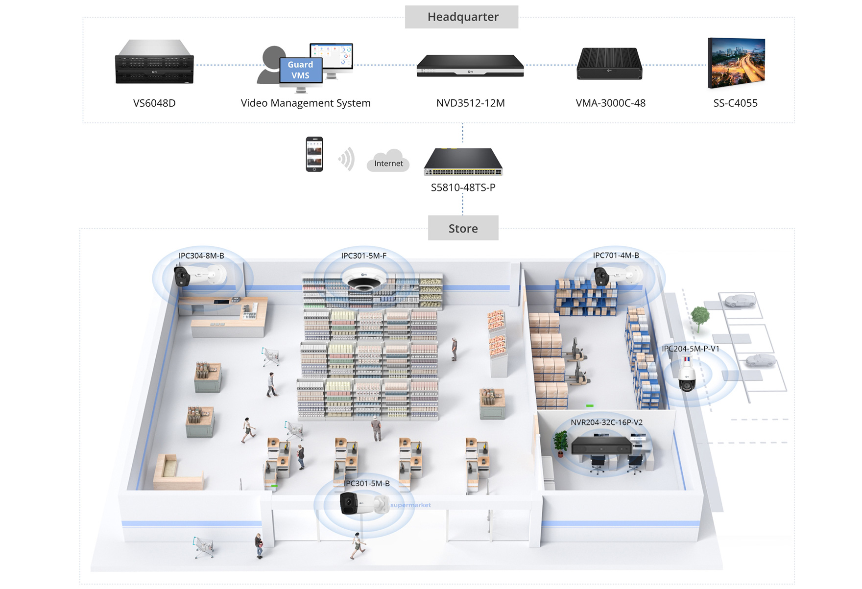 In the FS retail video surveillance solution, the retail store headquarters is composed of VMS+IPSAN+VMA+display control. VMS is connected to the NVR equipment of each branch. IPSAN selects the recordings in the core areas of each store for backup. The VMA intelligent analysis server performs intelligent analysis on the videos in the core areas. And product-related alarm information is provided to facilitate managers to better manage chain stores. The branch is composed of NVR+IP cameras. The IP cameras adopts monitoring images in various backgrounds. The NVR uniformly manages the IP cameras of the current branch and provides storage space to facilitate viewing of live events and video playback.
