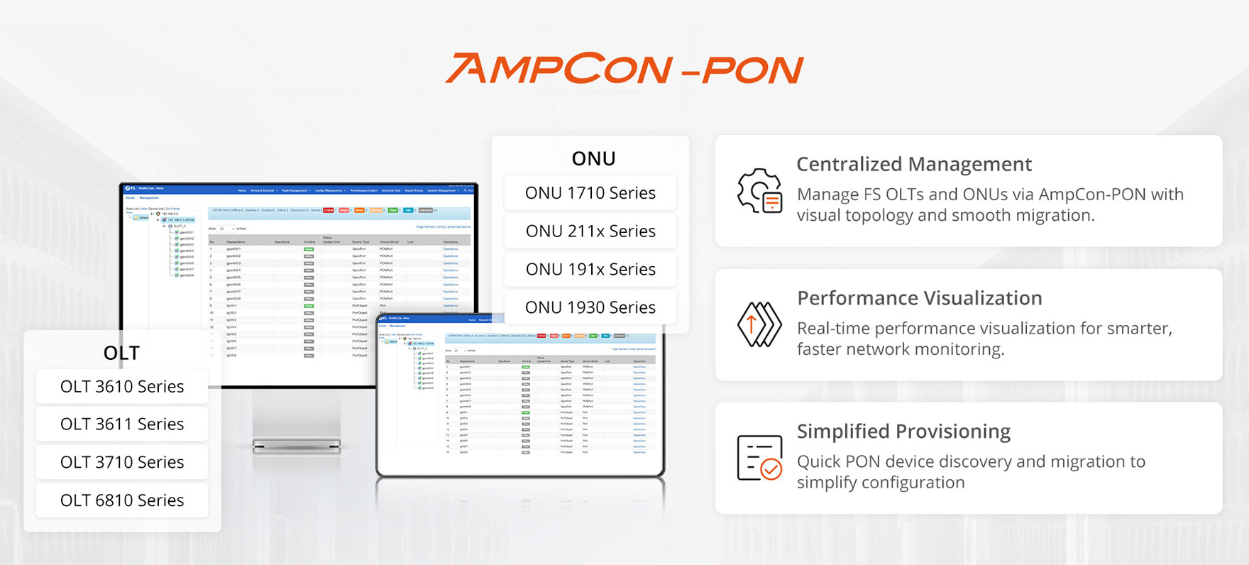 When paired with FS OLTs, AmpCon-PON enables flexible QoS control, dynamic bandwidth allocation, and automated device discovery, helping ISPs and enterprises efficiently manage thousands of subscribers while reducing OPEX.