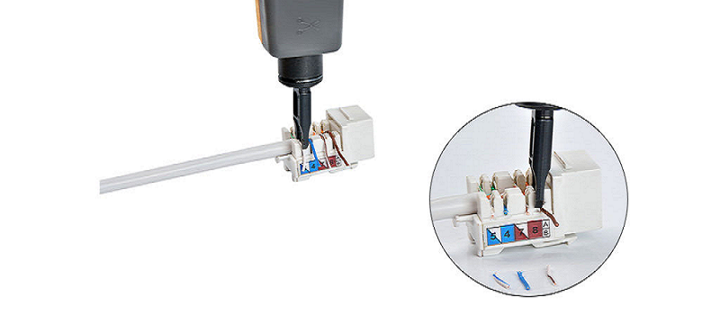 Use a 110 punch down tool to firmly press down on each wire so that it is grasped by both sets of teeth of the insulation displacement connector. If your punch down tool has a cutting edge, you can use it to cut the excess wire of the Ethernet cables during the pushing process.