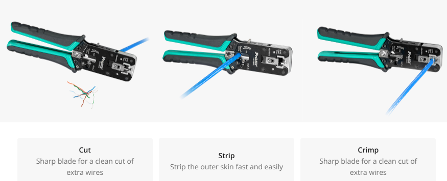 In addition to jacket stripping and cable cutting, these tools are designed to crimp RJ45 connectors onto bulk Ethernet cables. During use, the cable is stripped to the required length, conductors are arranged into the connector, and the crimping mechanism applies uniform pressure to secure the RJ45 plug. This integrated workflow improves efficiency and reduces the need to switch between separate tools, making it a practical copper crimping tool choice for field terminations.