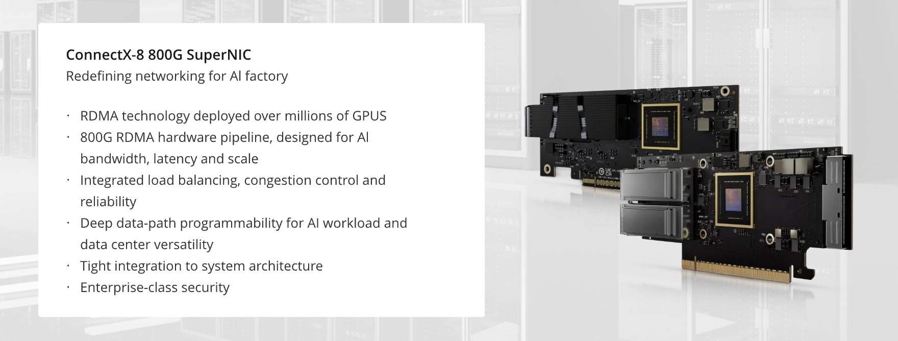 These capabilities allow critical data paths—such as collective communication, synchronization traffic, and storage access—to be handled efficiently by the NIC, reducing host overhead and improving overall system utilization. As a result, ConnectX-8 SuperNICs deliver consistent performance, scalability, and efficiency across different form factors and port configurations, forming a common architectural foundation for next-generation AI data centers.
