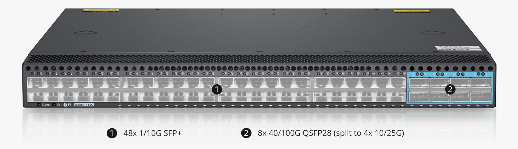 The FS N5860-48SC is a 48 × SFP+, 8 × QSFP28 L3 data center switch, built on Broadcom BCM56873 Trident 3 silicon in a compact 1U form factor. It delivers 10GbE server access through the SFP+ ports and 40/100GbE uplinks via QSFP28, with multiple breakout options for flexible deployment.