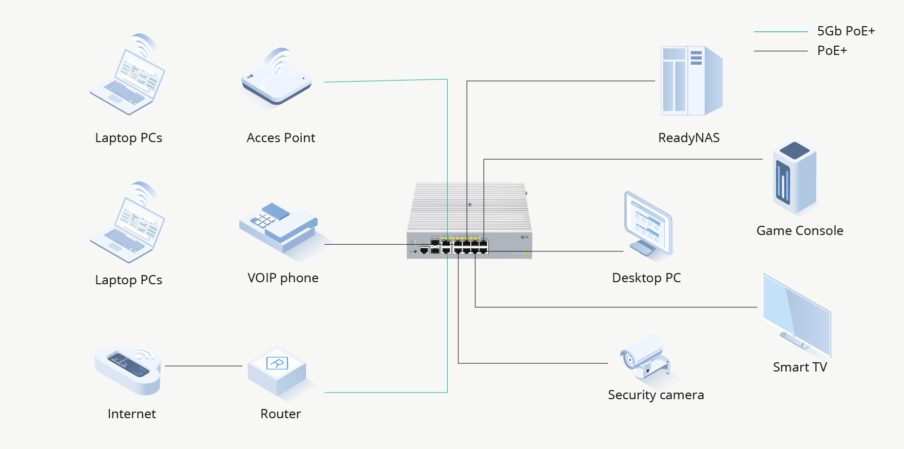 8× 1G RJ45, 2× 1/10G SFP+ | 2× 5Gb PoE+ | Ideal for IP cameras, Wi-Fi APs, and powered edge devices | |