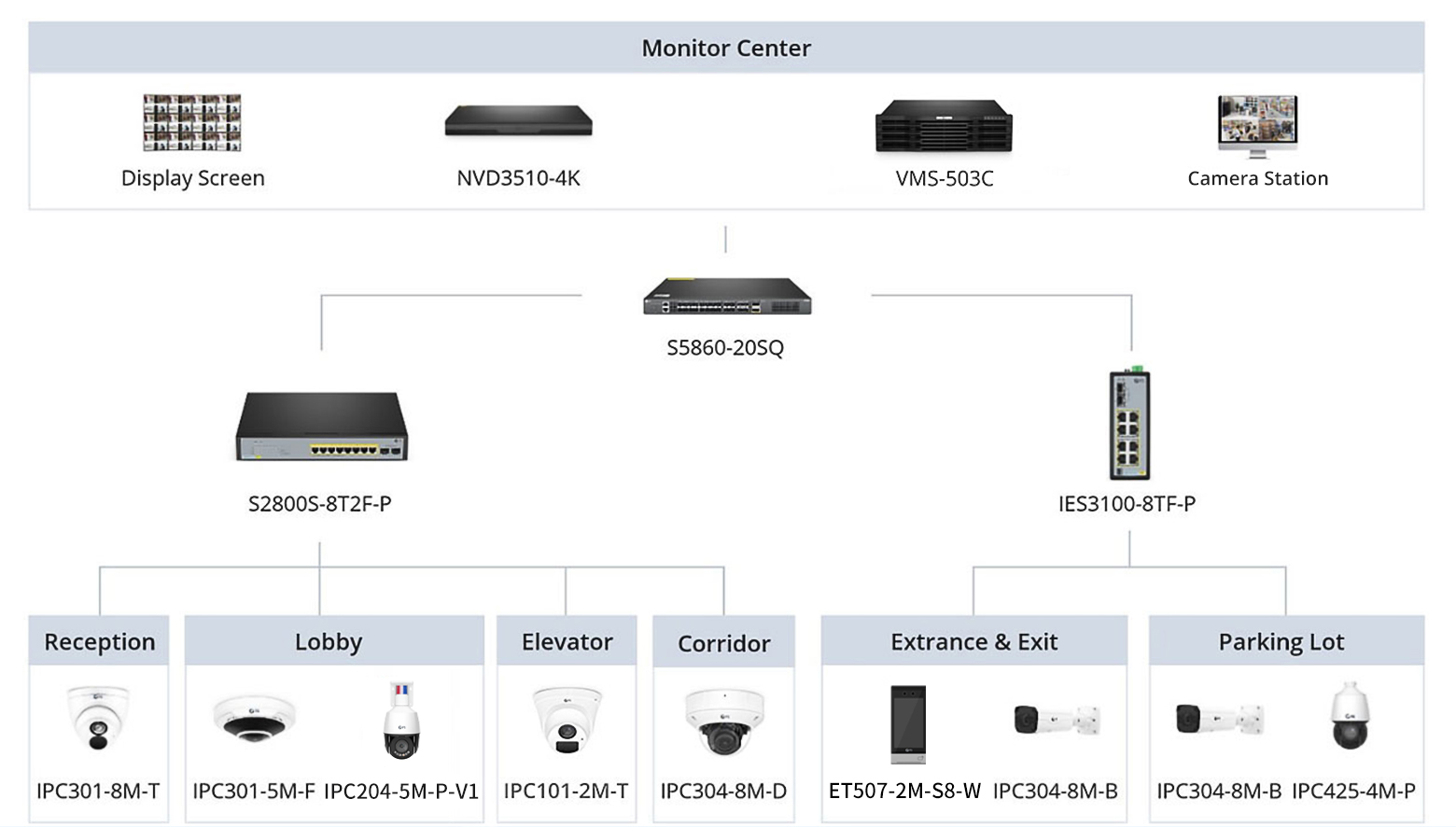 FS video surveillance solution for apartment buildings & multifamily uses temperature recognition cameras, face recognition terminals, face capture cameras, and intelligent perimeter protection cameras, which can intelligently and efficiently realize personnel control and risk early warning. Combined with VMS-503C all in one video management system platform to achieve unified deployment, management and video storage of all cameras. It can not only ensure the safety and reliability of multifamily building, but also realize the efficient management of the system.