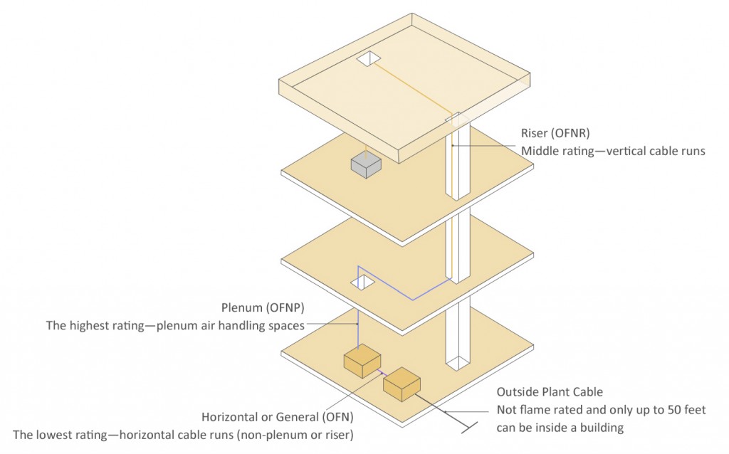 When it comes to deploying cables for indoor applications, the important factor that should be considered is flame ratings. According to the NEC (National Electric Code), flame ratings generally include plenum, riser, general, etc., as shown in the following picture: