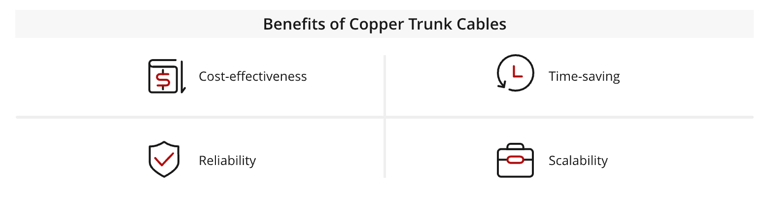 Reduce Cabling Costs: By eliminating the need for on-site termination, copper trunk cables help reduce installation time and associated labor costs. This cost efficiency can reduce labor costs by up to 90% in data center installations, making them especially valuable for large-scale or even outdoor networking projects.