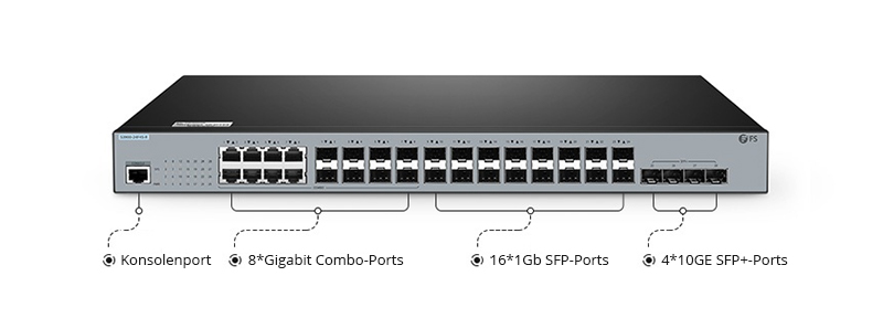 Veranschaulichung der SFP-Ports auf einem Gigabit-Switch am Beispiel des SFP-Port-Switch FS S3900-24F4S-R: