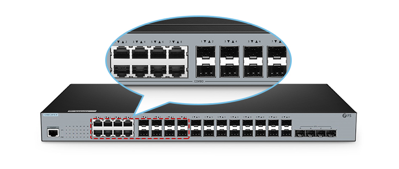 Der Combo-Port ist eine einzige Schnittstelle mit zwei Front-Ends – also ein RJ45-Port oder ein SFP-Port. Er unterstützt sowohl Kupfer- als auch optische SFP-Verbindungen. Es handelt sich also um einen Compound-Port, der zwei unterschiedliche physische Ports unterstützen kann, die sich dieselbe Switch-Struktur und Port-Nummer teilen. Diese beiden unterschiedlichen physischen Ports können jedoch nicht gleichzeitig verwendet werden. Jeder duale Combo-Port ist eine einzelne Schnittstelle, die zwei Verbindungen bietet: eine RJ-45-Verbindung für ein Kupfer-Ethernet-Kabel und eine SFP-Verbindung für ein Glasfaserkabel. Wenn beispielsweise der Combo-SFP-Port verwendet wird, wird der entsprechende Kupferanschluss automatisch deaktiviert und umgekehrt. Die folgende Abbildung zeigt die 8*1GE-Combo-Ports des FS S3900-24F4S-R SFP-Stack-Switch.