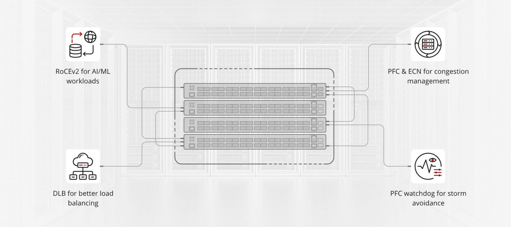 Equipped with built-in RoCEv2 capabilities, the 400G switch offers advanced features such as PFC, ECN, and dynamic load balancing, enabling low-latency, lossless communication for RDMA-based AI workloads—without requiring additional investment in network infrastructure.