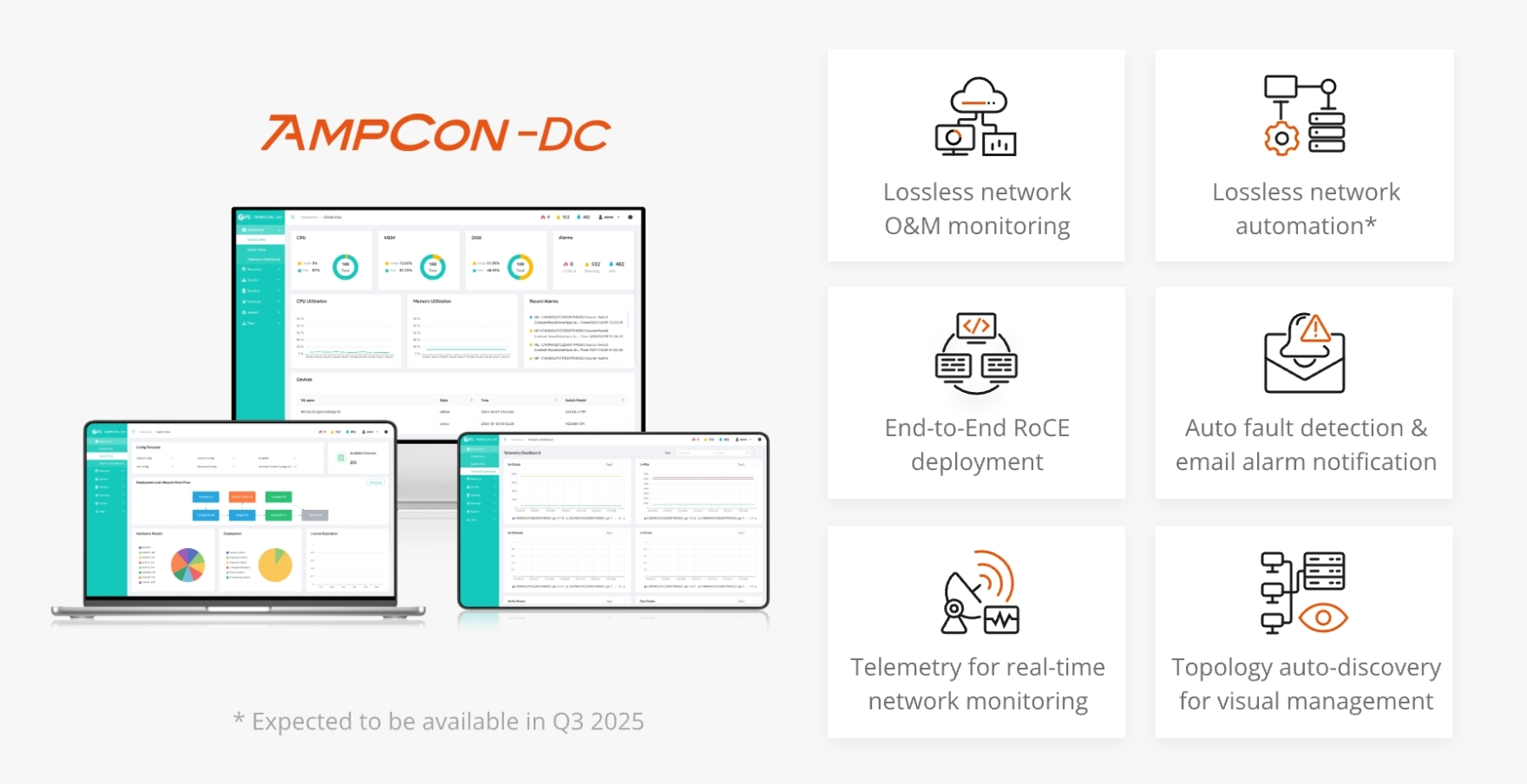The AmpCon-DC management platform manages PicOS® data center switches to configure, monitor, perform preventive troubleshooting, and maintain high-performance networks, thereby improving resource utilization and reducing operational costs. Enterprises can achieve fully automated operations and maintenance from Day 0 to Day 2+, improving management efficiency, saving labor costs, and shortening deployment cycles.