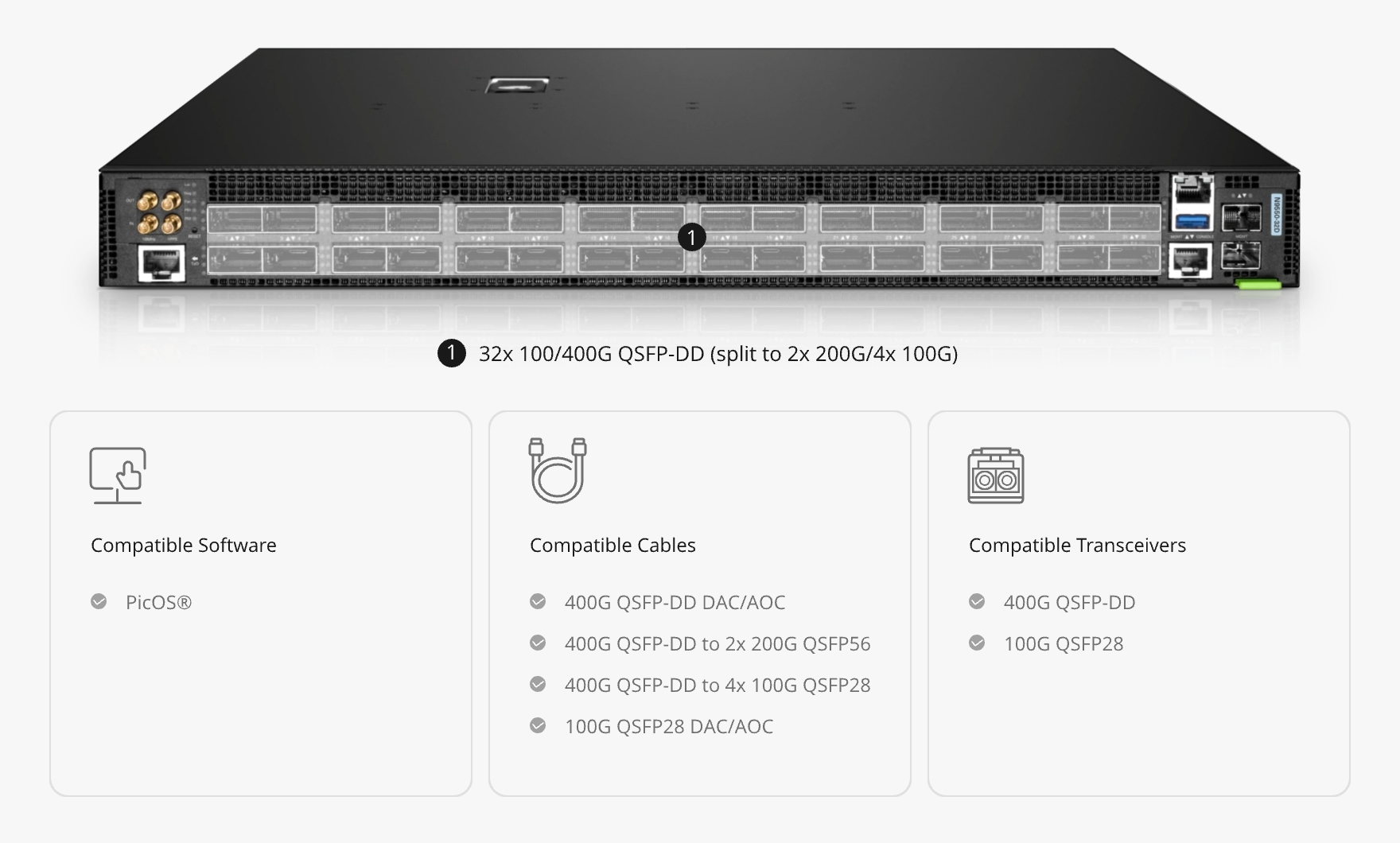 Deeply integrated with FS 400G optical modules and DAC/AOC cables to form an end-to-end optimized link. Combined with PicOS®'s open API interface, it enables seamless integration with management platforms, providing comprehensive performance optimization from the physical layer to the control layer.