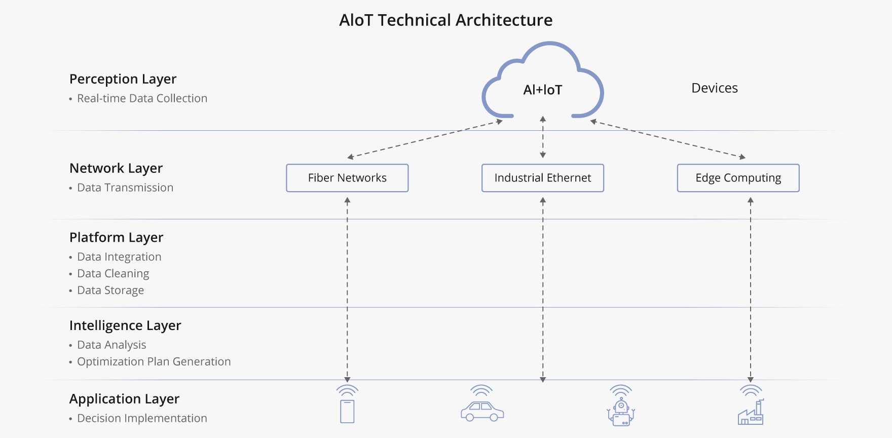 AIoT’s technical architecture can be divided into five core layers: the Perception Layer, Network Layer, Platform Layer, Intelligence Layer, and Application Layer. Each layer performs a specific role, and through coordinated operation, they form a complete intelligent closed loop of “perception → analysis → decision → execution → feedback.”