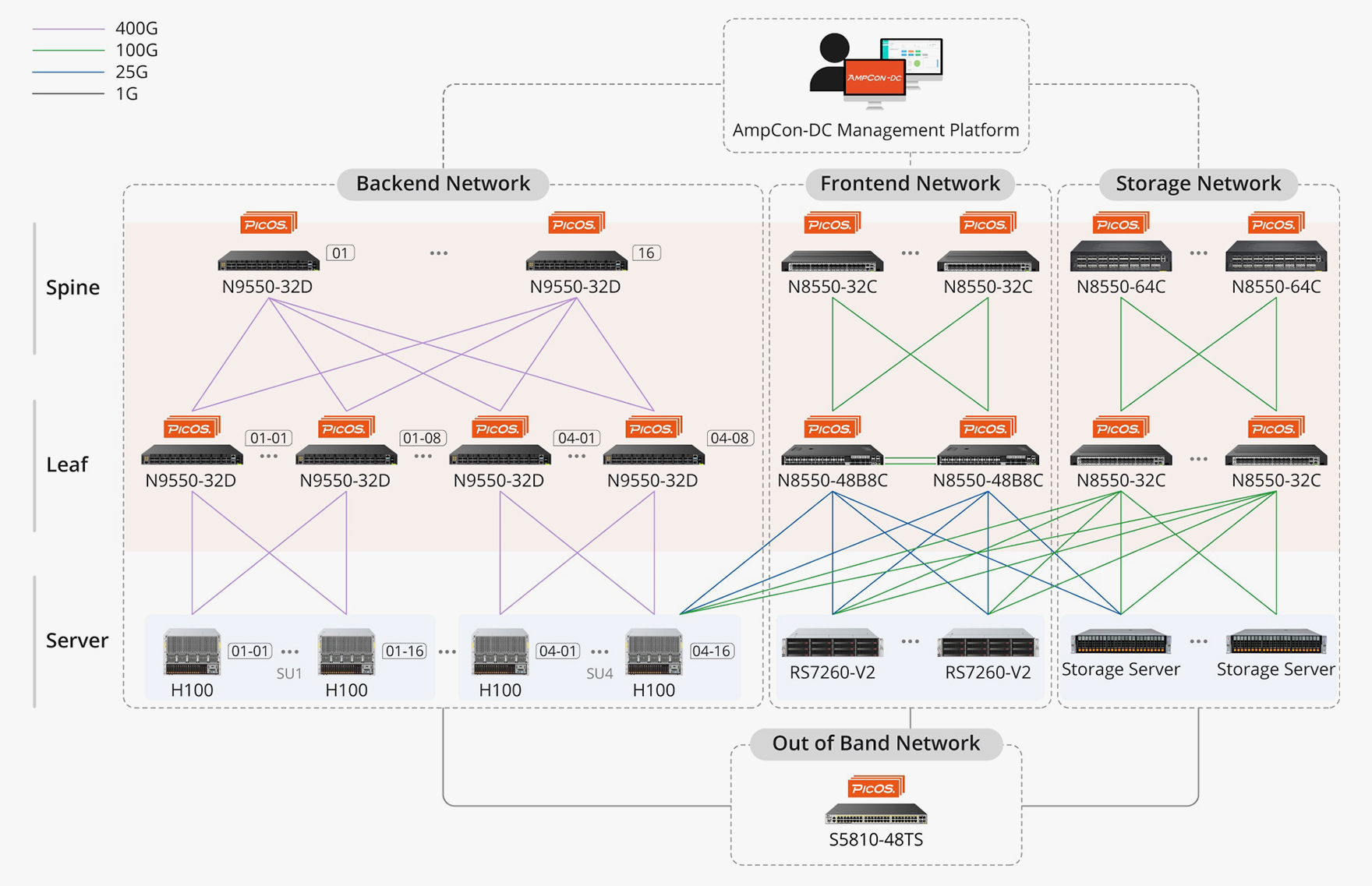 To simplify system complexity and improve operational efficiency, FS adopts a Spine-Leaf scalable architecture combined with PicOS® network OS and AmpCon management platform. The solution enables automated configuration, real-time monitoring, and intelligent operations and maintenance, reducing manual intervention and lowering operational costs. Its modular design allows enterprises to expand from small experimental clusters to large-scale deployments without disrupting existing operations, addressing both deployment complexity and cost concerns.