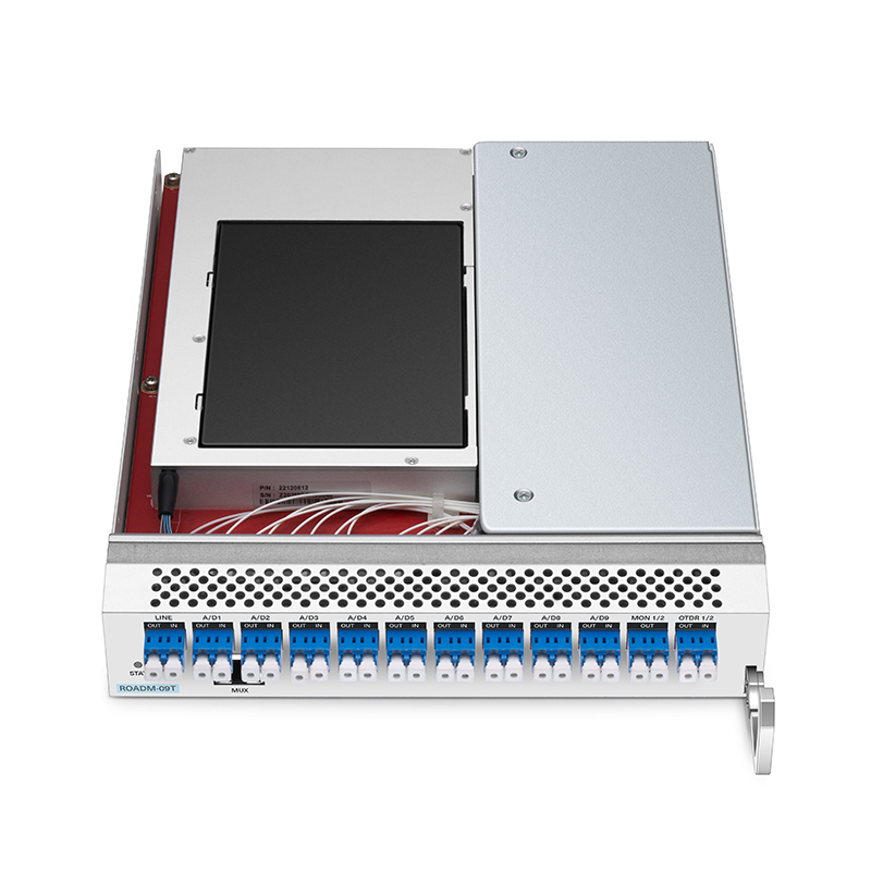 La serie D7000 ROADM-09T si basa sulla tecnologia avanzata di commutazione selettiva della lunghezza d'onda (WSS) di nuova generazione per supportare la configurazione di sistema completamente incolore, senza direzione e senza contesa (CDC-F). Questo Modulo è un preamplificatore e un amplificatore booster integrati che possono semplificare l'installazione e la scalabilità della rete ROADM migliorandone al contempo la flessibilità e le prestazioni complessive. ROADM-09T supporta una griglia flessibile N*12,5 GHz (4≤N≤12). Inoltre, questo Modulo può ottenere servizi di aggiunta e eliminazione o pass through.