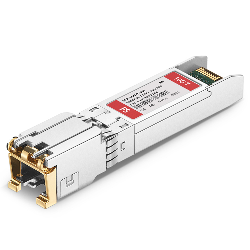 The 10GBASE-T module offers connectivity options at 10M/100M/1G/2.5G/5G/10Gbps data rates. The module features an SFP+ form factor and an RJ-45 interface, enabling the use of CAT5e/CAT6A/CAT7 cables for connecting to endpoints with embedded 10GBASE-T ports. It supports distances of up to 30 meters, providing a cost-effective solution for intra-rack and inter-rack connections.